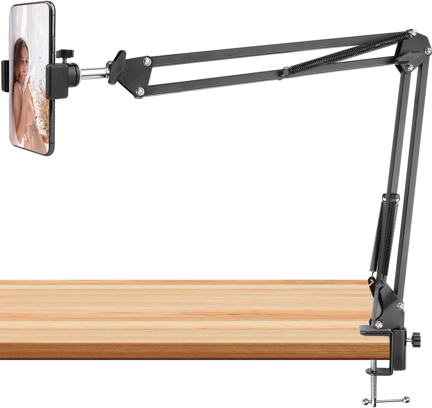 Review Overhead Phone Holder, Sanchamy Video Stand Articulating Arm Phone Mount Table Top Scissor Boom Phone Stand Tablet Holder Webcam Clamp for Streaming Phone Baking Crafting Videos.
