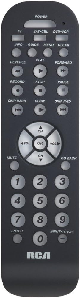 RCA RCR3273N 3-Device Universal Remote. Controls TV, satellite/cable & DVD/VCR, Supports all major brands of TVs, Ergonomic design, Auto code search, Brand/manual code searches & direct code entry, Menu & guide support, Dim: 7.5"H x 2"W x .9"D, Requires 2 AAA batteries;