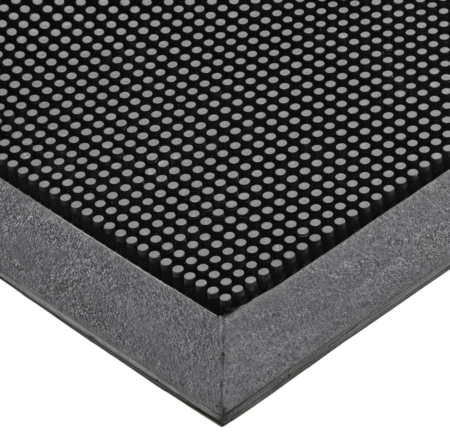 Best 345 rubber brush entrance mat. Rubber Brush mats are constructed of tough SBR rubber to remain flexible while withstanding extreme cold. Thousands of tough, flexible rubber fingers sweep shoes clean while suction cups on the underside of the mat help to minimize shifting. Due to its durable construction, Rubber Brush is the perfect year round outdoor entrance mat for schools, municipal buildings, plant entrances, and office buildings. Test - Test Description - Results: (1) Abrasion Resistance ASTM D3884-01 - Test specimen is subjected to the rubbing action of two abrading wheels under controlled conditions. Results measured in Weight loss (Grams) - 3. 12. (2) Accelerated Wear - Test specimen is subjected to the action of rollers under a specified load. Sample is rotated 10 degree after each pass. Results measured in thickness loss (percent) - 0. 77 percent. (3) Accelerated Soiling ASTM D6540-00 - Test specimen is subjected to an accelerated soiling process. for a predetermined length of time. The sample is vacuumed, rated, submitted to an extraction device, then rated again. - N/A. (4) Water Retention - Test specimen is submerged in water for 5 minutes, removed, drained for 15 seconds and weighed. Results measured in weight gain. (Gallons per square yard) - 0. 03. (5) Flammability ASTM D2859 (CPSC FF 1-70) - Intended to measure the mattings response to an ignition source in a controlled environment. The uncharred area of the test specimen must be greater than 1 inch to pass. - 3. 6. All testing of NoTrax floor matting has been performed by an independent testing laboratory. Available in black color. Use for outdoor entrances of schools, municipal buildings, plant entrances, construction traffic area. Molded beveled edging on all 4 sides creates a retention dam to trap moisture.